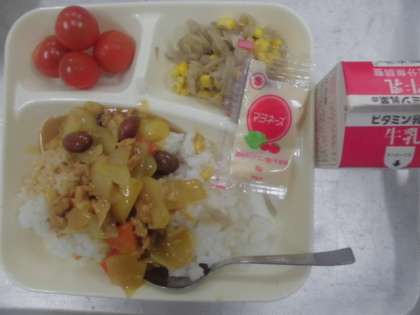 今日の給食のメニューは、豚肉と金時豆のカレーライス、ごぼうサラダ、プチトマト、牛乳、でした。豚肉と金時豆のカレーライスはまろやかなカレールウにやわらかく煮込まれたじゃがいもやにんじんが包まれていて、豚肉の旨みも広がっていました。めずらしく金時豆が入っていましたが甘くはありませんでした。ごぼうサラダはていねいにささがきされたごぼうにコーンが合わせてありました。プチトマトはみずみずしかったです。