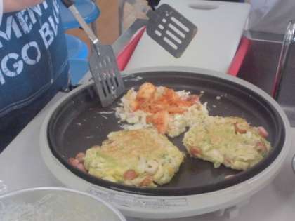 今日用意した食材は・・・ベーコン、ウインナー、ちくわ、もち、コーン、チーズ、キムチ、中華めん、ねぎ、かつおぶし、てんかす、紅しょうが、ソース、マヨネーズ、青のり・・・、豪勢です。準備ができたらホットプレートで焼いていきます。うまくできたかな。子どもたちは焼き具合が気になるのか、しょっちゅうお好み焼きのうらを持ち上げて確認していました。「もういいかい」「まーだだよ」…「もういいよ」。よし、いい感じで焼けました。