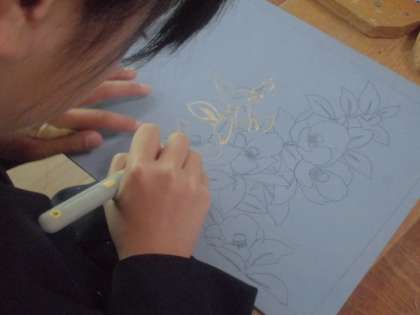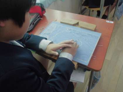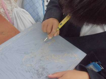 5年生が版画のために彫刻刀を使って板を彫っていました。下描きを見てみると、世界の名画が描かれていました。日本のものもあれば外国のものもありました。版画にしたとき、どんな感じに仕上がるのでしょうか。また少し変わった雰囲気になるのかもしれませんね。子どもたちは集中して真剣な表情で彫り進めていました。