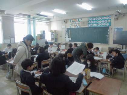 4年生が国語の授業で「ゆめのロボットを作る」という単元を学習しています。人々の暮らしや体の不自由な人を手伝うためのロボットが紹介されています。子どもたちはそれらの文章を読んで内容について理解したりまとめたりしています。今日はそれを受けて、自分が考えるゆめのロボットについて作文を書いていました。それをお互いに読み合って感想を発表し合っていました。