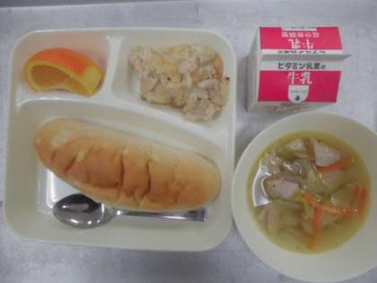 今日の給食のメニューは、押麦のグラタン、スープ、いよかん、牛乳、パン、でした。押麦のグラタンはクリーミーでまろやかなグラタンソースに鶏肉、押麦、たまねぎ、マッシュルームが包まれていました。押麦が入っていたので少しモチモチしていました。粉末チーズやパン粉が焦げて香ばしさが感じられました。スープはさっぱりとしたスープで飲みやすかったです。豚肉と細かく刻まれた野菜が入っていました。いよかんは果汁が多くおいしかったです。