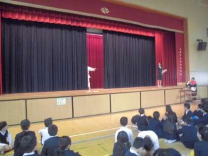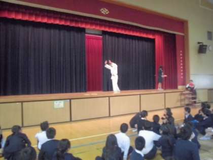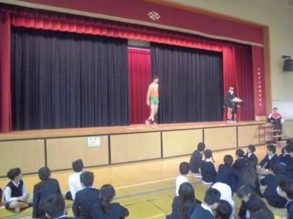 今日の児童集会は「このせんせい だれだ?」でした。1mほどあけたカーテンのすき間をいろんな恰好をした先生が走り抜けます。一瞬なのでけっこうわかりません。かつらをかぶっていたり陸上のユニフォームを着たり…、コスチュームも凝っています。なんと校長先生もクイズに…。今も現役という柔道着姿で登場です。背負い投げをしながら通り抜けていきます。子どもたちからは「今のこうちょうせんせいやー!」「えー、こうちょうせんせいなんー」と大きな歓声が上がっていました。校長先生も大忙しです。