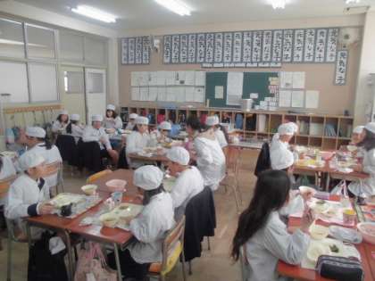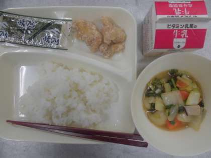 今日の給食のメニューは、鶏肉のからあげ、まる天と野菜のうま煮、焼きのり、牛乳、ごはん、でした。鶏肉のからあげは生姜とにんにくで下味がつけられていて、ころもはサクッと上手に揚げられていました。まる天と野菜のうま煮はしいたけのだしが香りよく、チンゲンサイが入っていて八宝菜のような感じでした。まるてんはねりもののおだんごです。焼きのりはごはんをつつんで食べました。