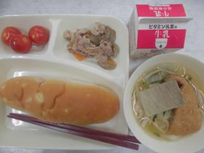 今日の給食のメニューは、豚肉とごぼうの煮物、なにわうどん、プチトマト、牛乳、パン、でした。豚肉とごぼうの煮物は少し甘めに作っただし醤油で豚肉、ごぼう、にんじんを煮込んでいます。ごぼうはやわらかくなるまで煮られていました。なにわうどんは大阪で生まれたと言われる「きつねうどん」に大阪で昔から作られている「とろろこんぶ」をのせて食べます。だから「とろろこんぶ」がついていました。おいしかったです。プチトマトは冷たくてみずみずしかったです。