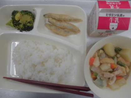 今日の給食のメニューは、きびなご天ぷら、一口がんもとじゃがいもの煮物、ブロッコリーのごま和え、牛乳、ごはん、でした。きびなご天ぷらはころもはカリッと揚げられていて身はしっかりとつまっていました。一口がんもとじゃがいもの煮物はやさしい甘さの和風だしが一口がんもや大根にしみ込んでおいしかったです。その他にも豚肉、じゃがいも、にんじん、たまねぎ、三度豆が入っていていろどりもきれいでした。ブロッコリーのごま和えはいりごまの香りが効いていました。