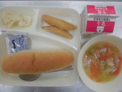 今日の給食のメニューは、わかさぎフライ、白菜のスープ、カリフラワーのサラダ、牛乳、パン、でした。わかさぎフライは身はやわらかく、ころもはサクッと上手に揚げられていました。味もしっかりとついていました。白菜のスープはチキンスープをベースに塩こしょう、醤油で味がととのえられていて、パセリの香りがアクセントになっていました。透明感のあるスープに白菜、鶏肉、にんじん、コーンが入っていました。カリフラワーのサラダは米酢でさっぱりとしていました。