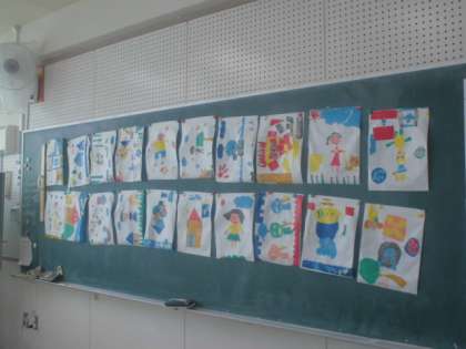 1年生の子どもたちの「かみはんが」を黒板にはって乾かしていました。