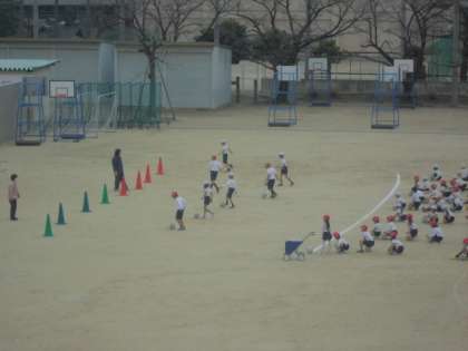 1年生の子どもたちが体育の授業でボールけりあそびをしていました。