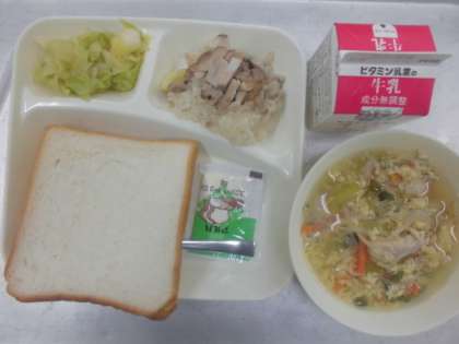 今日の給食のメニューは、中華おこわ、卵スープ、キャベツのオイスターソース炒め、牛乳、パン、でした。中華おこわはもちもちしていてしいたけとごま油の香りが効いていました。焼き豚とくりが入っていて味もしっかりとついていておいしかったです。卵スープは中華風で少しとろみがあって鶏肉、チンゲンサイ、もやしが入っていて卵でとじられていました。キャベツのオイスターソース炒めはオイスターソースが香ばしく感じられました。