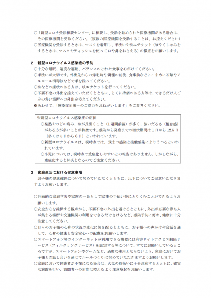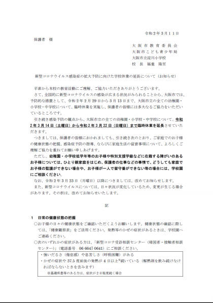 本日、大阪市教育委員会より臨時休業延長について通達がありました。期間が3月14日(土曜日)から3月22日(日曜日)となります。3月23日(月)以降の予定につきましては、通知が届き次第お知らせします。詳しくはホームページに掲載しています。ご確認をお願いします。