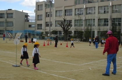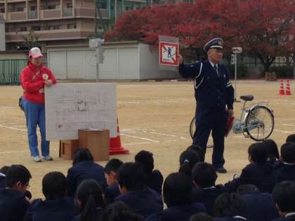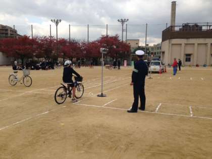 都島警察と都島区役所の方々の協力を得て、交通安全指導を行いました。運動場に信号や交通標識などを設置し、白線でかかれた道路を使って行いました。1〜2年は安全な歩行、3〜6年は自転車の乗り方を学びました。今回の指導を日常の生活に是非役立ててもらいたいです。