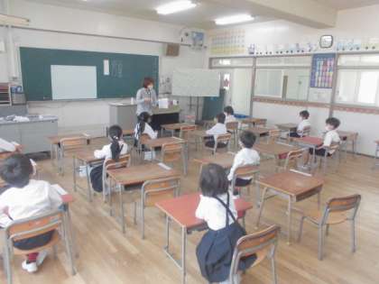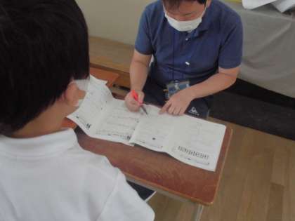 登校日も3回目となり、子どもたちも表情が緩んでみんなにこやかです。慣れてきました。やっぱり学校に子どもたちがいるのはいいですね。活気が出てきました。6年生はさっそく国語の学習です。プリントにまとめたことを順番に発表していきます。2年生は課題プリントを先生にみてもらっていました。○をつけてもらってうれしそうです。1年生はしずかにすわって先生のの話をよく聞いていました。少しずつ少しずつ、学校が本来の姿を取り戻しつつあります。