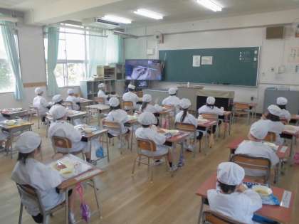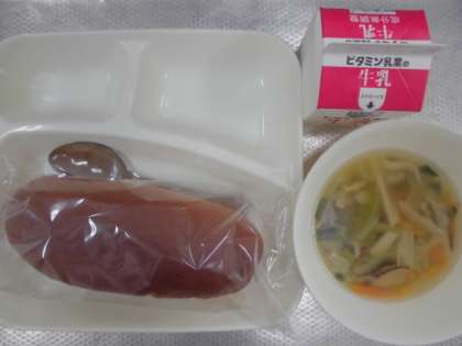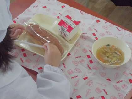今日の給食のメニューは中華スープ、牛乳、パン、でした。12日(金)までは簡易給食献立のため品数が少なくなっています。中華スープはしいたけのもどし汁が効いていて味に深みがありました。細かく刻まれたたけのこ、しいたけ、にんじん、キャベツ、にら、そして焼き豚が入っていました。1年生はストローのビニール包装からストローを取り出して牛乳パックにつきさす練習をみんなでしていました。簡単なようで、実はこぼさずに全員が同じ手順でするのはなかなか難しいものです。後片づけの仕方も覚えないといけません。給食一つとっても覚えることはたくさんあるんですね。