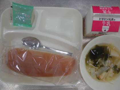 今日の給食のメニューはすまし汁、牛乳、パン、でした。12日(金)までは簡易給食献立のため品数が少なくなっています。すまし汁は透明感があり昆布とけずりぶしのだしがしっかりととられていておいしかったです。具材にはキャベツ、かまぼこ、えのきだけ、わかめが入っていました。
