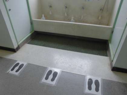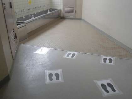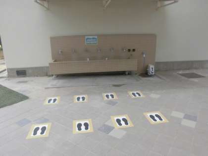 新型コロナウイルス感染防止対策として設置しています。子どもたちは何も言わなくても、このあしがたを見て自然と距離をとって並んでいました。ソーシャルディスタンスですね。マスクの着用や手洗い、うがい、換気などとあわせて、これからも密にならないように工夫をしていきます。