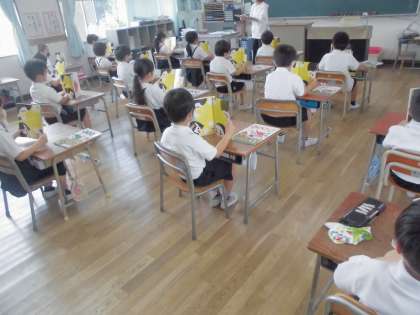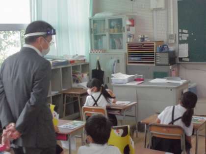 1年生の子どもたちが国語の教科書を手に持って先生に続いて文章を読んでいました。その声に誘われて校長先生もやって来られました。校長先生はフェイスシールドをしています。子どもたちは「何それー」「ぼく知ってるよー」「見たことあるー」…うれしそうに校長先生に話しかけていました。学校では感染症対策として順次フェイスシールドも取り入れていきます。マスクの着用や手洗い、うがい、換気、あしがた、フェイスシールド、消毒、子どもたちへの密を避けるための指導・・・いろいろな取り組みを進めています。