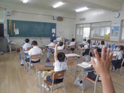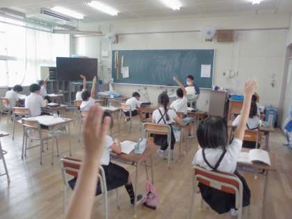 2年生が国語の授業で「風のゆうびんやさん」というお話を読んでいました。読んだ後に先生が出てきた登場人物やできごと、お話の流れなどについて尋ねていきます。子どもたちは進んで手をあげて質問にこたえていました。よく話の内容を把握しているようでした。