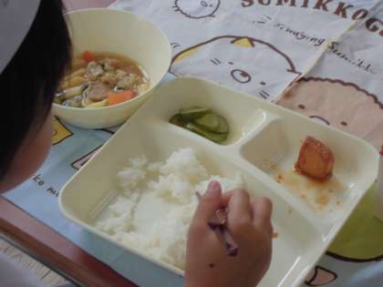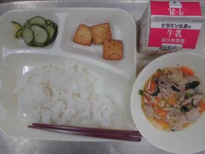 今日の給食のメニューは、中華煮、厚揚げのピリ辛じょうゆかけ、きゅうりの中華和え、牛乳、ごはん、でした。今日から通常の給食献立に戻りました。1年生の子どもたちは、いつもより品数が多いので驚いていました。「せんせー、なんできょうはお揚げがついてるの」「せんせー、なんできゅうりがあるの」…「えーっ、きょうはごはんなん」「たくさんたべれる、うれしいーーっ」。中華煮は豚肉、にんじん、たまねぎ、キャベツ、たけのこ、にらが入っていて具だくさんで、中華の素で濃いめに味が付けられていてとろみもあり、ごはんとよく合いました。厚揚げのピリ辛じょうゆかけはトウバンジャンが効いていて味が厚揚げにしっかりとしみ込んでいました。きゅうりの中華和えはごま油の香りがしましたが全体的にさっぱりとした感じに仕上がっていました。