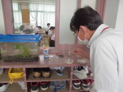 5年生の先生がピンセットでなにやら。