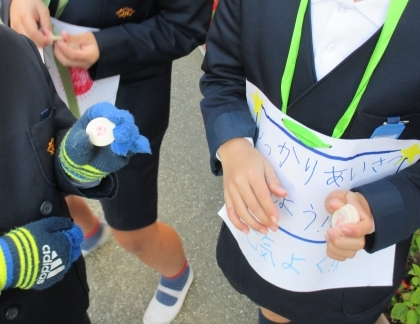 12月の初めの1週間は「あいさつ運動」です。登校時に児童会の子どもたちがあいさつを呼びかけます。よいあいさつができた人には手作りの「スマイルキャップ」渡されます。