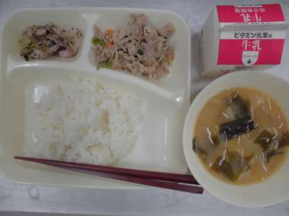今日の給食のメニューは豚肉と野菜の炒め物、みそ汁、キャベツの赤じそ和え、牛乳、ごはん、でした。豚肉と野菜の炒め物は豚肉がにんじん、ピーマン、もやしと一緒に炒められていて、しょうゆの香ばしさが感じられ、ごはんともよく合いました。みそ汁はだしがしっかりととられていて、わかめがたくさん入っていました。キャベツの赤じそ和えはさっぱりとした口あたりでした。