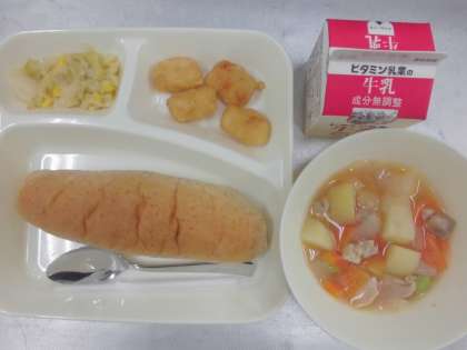 今日の給食のメニューはいかてんぷら、フレッシュトマトのスープ煮、サワーソテー、牛乳、パン、でした。いかてんぷらはころもにも味がしっかりとついていてサクッと揚げられていました。フレッシュトマトのスープ煮はチキンスープをベースにトマトの酸味を活かしたスープに仕上がっていて暑い時にぴったりな感じでした。鶏肉、にんじん、たまねぎ、じゃがいも、枝豆、トマトが入っていました。サワーソテーはキャベツとコーンの甘みが感じられました。
