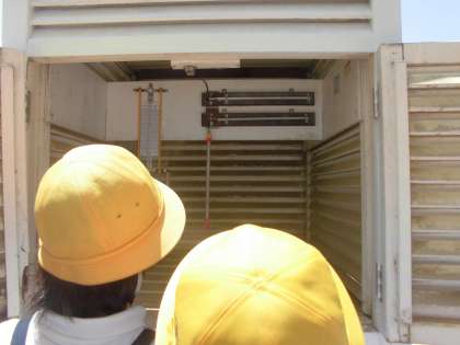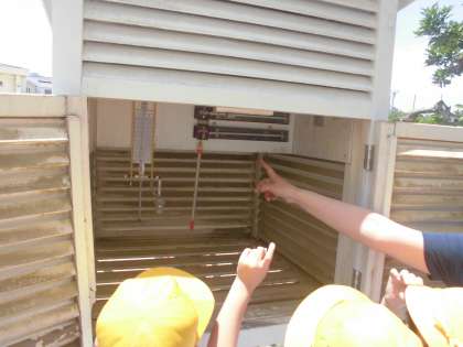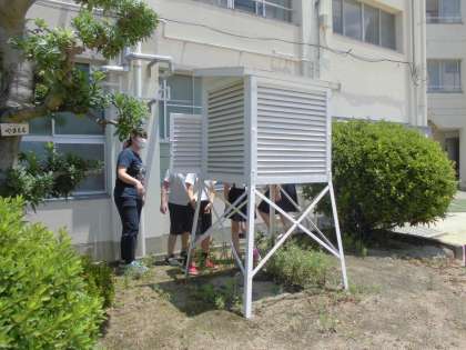 理科の学習で4年生の子どもたちが百葉箱(ひゃくようばこ)の中をのぞいていました。