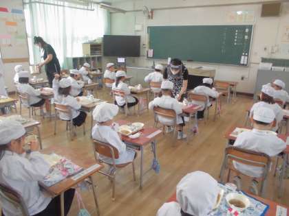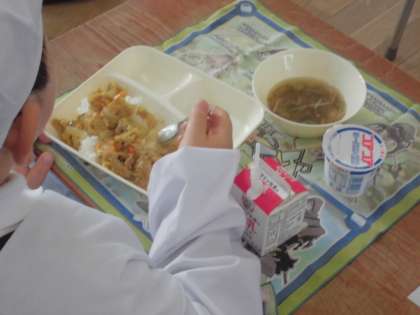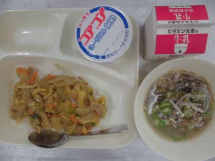 今日の給食のメニューは和風カレー丼、もずくとオクラのとろり汁、ヨーグルト、牛乳、でした。和風カレー丼は和風だしにカレールウを入れてちょうどよいとろみ具合で、うすあげにもしんなり味がしみ込んでいました。細かくきざまれたにんじん、たまねぎと生姜で香りよく炒められた豚肉が入っていました。もずくとオクラのとろり汁は薄味ですがしっかりとだしが効いていておいしかったです。ヨーグルトはめったに出ないので、子どもたちも喜んでいました。