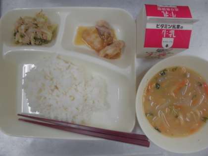 今日の給食のメニューは、鶏肉のおろしじょうゆかけ、みそ汁、野菜炒め、牛乳、ごはん、でした。鶏肉のおろしじょうゆかけは料理酒と塩で下味をつけた鶏肉をやわらかく蒸し焼きにし、おろしじょうゆをかけると和風風味でとてもおいしく、ごはんともよく合いました。みそ汁はにんじん、たまねぎ、うすあげ、じゃがいも、だいこん葉と具だくさんで、野菜中心で体にやさしかったです。野菜炒めはピーマンとキャベツがツナと一緒に炒められていました。ツナの味は子どもたちも大好きです。