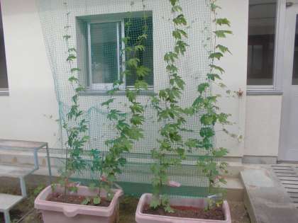 緑のカーテンは植物を建物の外側に生育させることにより、建物の温度上昇抑制を図ることができます。学校でもほんの一部ですが行っています。今年はゴーヤで挑戦です。ゴーヤは病害虫がつきにくく、肥料や農薬もほとんど不要な緑のカーテンの代表格のようです。管理作業員さんがいつも水をあげてくれています。一週間で1m以上ものびています。