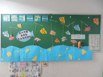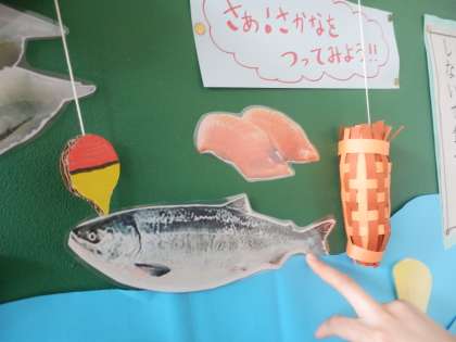 「昨日 お寿司屋さんにいってきたよ!」「マグロをたくさんたべた!」という声が子どもたちからよく聞こえます。みんなが食べている魚は、どんな姿をしているのでしょうか?実際に釣ってみて確かめたくなる食育の掲示板です!