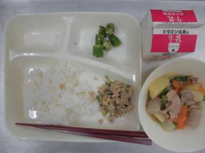 今日の給食のメニューは、豚肉とじゃがいもの煮物、オクラの梅風味、ツナっ葉炒め、牛乳、ごはん、でした。豚肉とじゃがいもの煮物はしょうゆベースの甘めの和風だしで豚肉、じゃがいも、にんじん、たまねぎ、つなこんにゃくがしっかりと煮込まれていて味がしみ込んでいました。三度豆の緑で彩りもきれいでした。オクラの梅風味は蒸したオクラに梅肉や米酢で作ったドレッシングがかけられていました。ツナっ葉炒めはツナと大根の葉が一緒に炒められていて、ごはんとの相性がとてもよかったです。