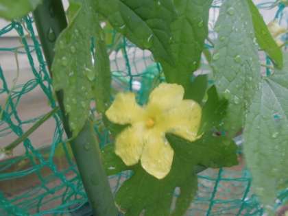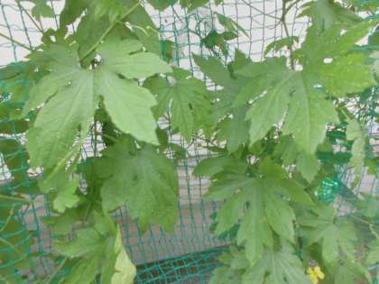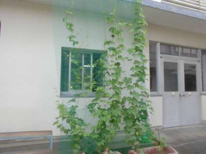 今日は給食でゴーヤが出たので、緑のカーテンで育てているゴーヤを見てみました。やっぱり成長が早いですね。あっという間に2階まで伸びていました。黄色い花が咲いていました。