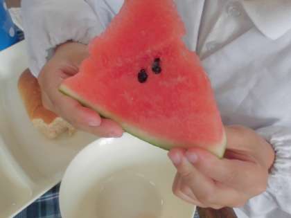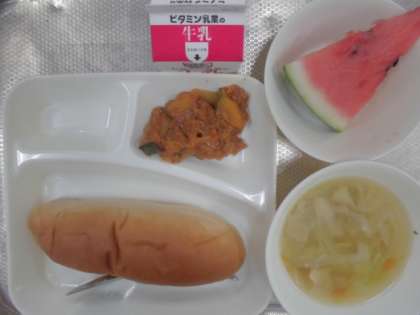 今日の給食のメニューは、かぼちゃのミートグラタン、スープ、すいか、牛乳、パン、でした。かぼちゃのミートグラタンはにんにくの香りが効いていて、牛豚ひき肉の旨みとかぼちゃの自然の甘さが引き出されていました。パン粉の焦げ目もあり香ばしさもありました。スープはチキンスープがベースで鶏肉、にんじん、キャベツ、コーン、パセリが入っていました。すいかは冷えていて夏を感じました。