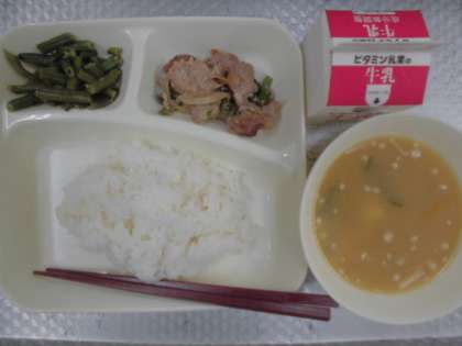 今日の給食のメニューは、豚肉の生姜焼き、みそ汁、三度豆のごま和え、牛乳、ごはん、でした。豚肉の生姜焼きはたまねぎとピーマンが一緒に炒められていて、たれが全体になじんでごはんがすすみました。みそ汁はかぼちゃが入っていて、少し甘みととろみ感のあるみそ汁に仕上がっていました。三度豆のごま和えはゆでた三度豆にごまの香りが効いたしょうゆベースのたれがかけられていました。
