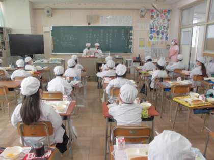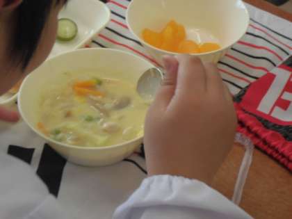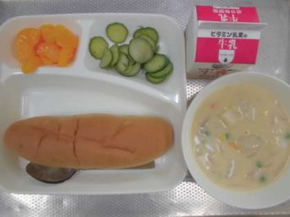今日の給食のメニューは、コーンクリームシチュー、きゅうりのバジル風味サラダ、みかん(缶)、牛乳、パンでした。コーンクリームシチューはバターと小麦粉から作る特製のルウでとてもまろやかなシチューに仕上がっていました。じゃがいもがホクホクとやわらかく、鶏肉もおいしかったです。きゅうりのバジル風味サラダはワインビネガーの甘酸っぱさとバジルの香りがほんのりしていました。みかん(缶)は子どもたちも大好きです。