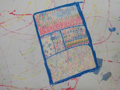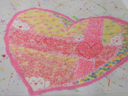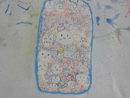 4年生の図工の作品です。よく見てみると細かい絵がぎゅうぎゅうに詰め込まれています。非常に根気のいる作業だと思いました。子どもたちが集中して取り組んでいたようすが目に浮かびます。