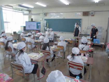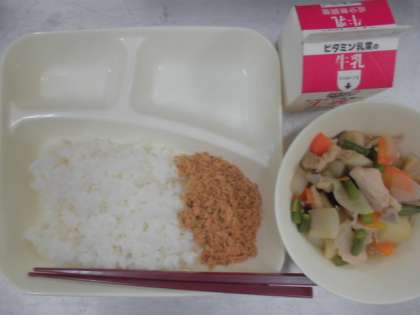 今日の給食のメニューは、鶏肉とじゃがいもの煮物、紅さけそぼろ、牛乳、ごはん、でした、鶏肉とじゃがいもの煮物はしいたけのもどし汁が効いた甘めの和風だしで鶏肉、じゃがいも、にんじん、たまねぎ、しいたけ、三度豆がやわらかく煮られていました。味もしっかりとしみ込んでいました。紅さけそぼろはとても細かくてパラパラしていました。ごはんにふりかけのようにして食べました。
