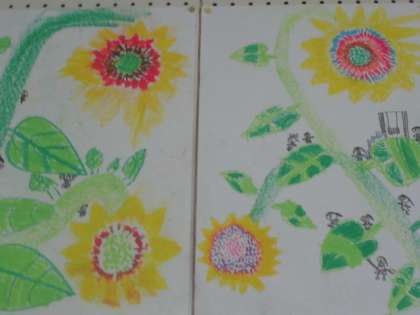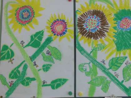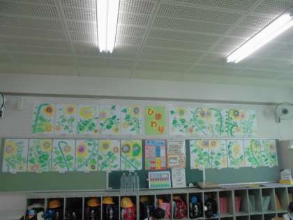 1年生の教室の後ろに子どもたちが描いたひまわりの絵が掲示してありました。夏真っ盛りの中、元気いっぱいに育っているひまわりが描かれています。教室がとても明るく感じました。
