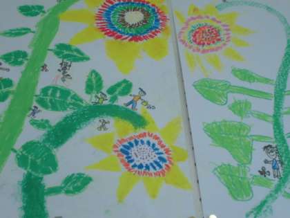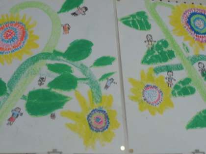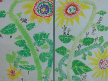 絵の中にはひまわりの上を走り回っている子どもたちの姿も描かれています。どの子も楽しそうで、まるでひまわりの公園のようです。細かな部分まで描いたり色をぬったりしてあったので驚きました。
