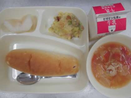 今日の給食のメニューは、豆乳マカロニグラタン、トマトスープ、なし、牛乳、パン、でした。豆乳マカロニグラタンはベーコンの食感がアクセントになっていて、マカロニとたまねぎ、マッシュルームなどが豆乳の入ったまろやかなグラタンソースに包まれていました。カレー粉が入っていてカレー味でした。トマトスープはチキンスープをベースにトマトの香りと酸味がしっかりと効いていて、とてもおいしかったです。なしは二十世紀なしで甘くてみずみずしかったです。