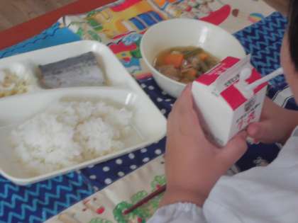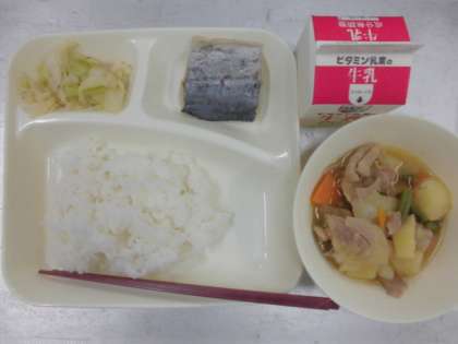 今日の給食のメニューは、さごしの塩焼き、豚肉とじゃがいもの煮物、キャベツの梅風味、牛乳、ごはん、でした。さごしの塩焼きは身はふっくらとしていて、骨もほとんどなく食べやすかったです。豚肉とじゃがいもの煮物は甘めの和風だしでしっかりと具材が煮られていて、やさしい味に仕上がっていました。豚肉、じゃがいも、にんじん、たまねぎ、つなこんにゃく、が入っていました。キャベツの梅風味はほんのり梅の香りがしてさっぱりとした口あたりでした。