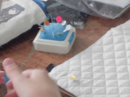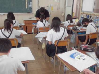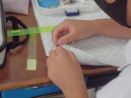 6年生が家庭科の授業でナップザックづくりをしていました。まだ始めたばかりでチャコペンシルでしるしをつけたり、針と糸で仮縫いをしたりしている段階でした。ものを入れてもやぶけたり穴があいたりしないように、このあとしっかりとミシンで縫っていきます。上手にできるといいですね。