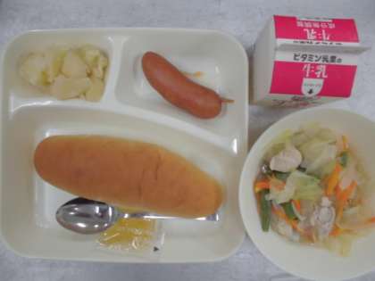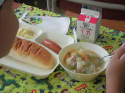 今日の給食のメニューは、フランクフルトのケチャップソース、スープ、焼きじゃが、牛乳、パン、でした。フランクフルトのケチャップソースは中心までしっかりとボイルされていて皮はパリッとはじけるような感じでした。手づくりのケチャップソースもマッチしていました。スープはチキンスープをベースに鶏肉、にんじん、たまねぎ、キャベツ、三度豆が入っていて、塩こしょうとしょうゆで味がととのえられていました。焼きじゃがは軽く塩が効いていてやわらかかったです。