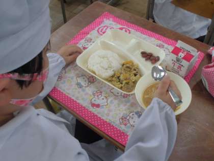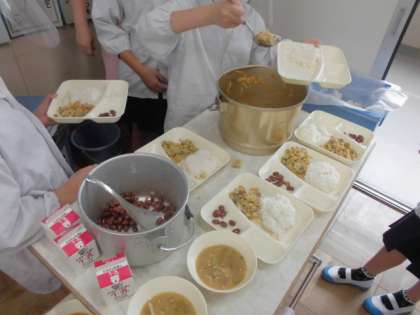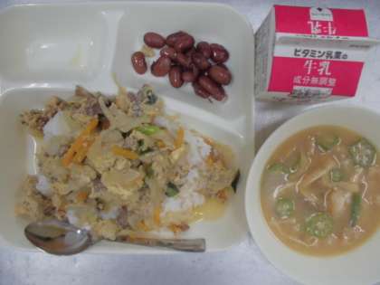 今日の給食のメニューは、他人丼、冬瓜のみそ汁、金時豆の煮物、牛乳、でした。他人丼はけずりぶしとだしこんぶでとった甘めの和風だしで牛肉、にんじん、たまねぎが煮られていていて、最後に卵でとじられていました。学校ではしっかりと火を通す必要があるため、お店で食べるようなトロっとした卵のとじ方はできませんが、ごはんにかけて食べると味がしっかりとついていておいしかったです。冬瓜のみそ汁はうすあげがみそ汁をたっぷり吸いこんでいて、冬瓜は口に入れるととけてしまうようでした。金時豆の煮物は甘くてやわらかかったです。