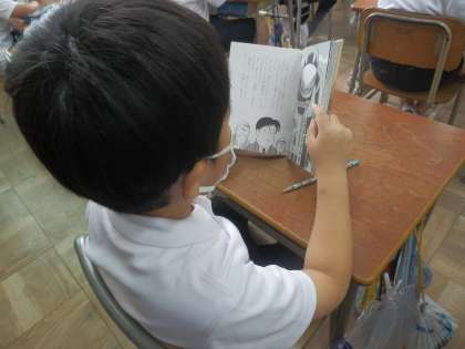 その本は、机の横の手さげかばんの中にあり、いつでも本に触れることができます。時間を見つけては、本の世界に入る子どもたちの姿がたくさん見られるようになってきました。