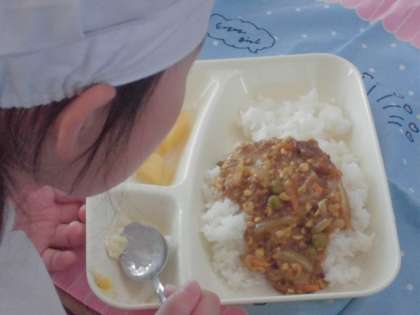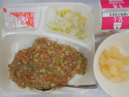 今日の給食のメニューは、大豆入りキーマカレーライス、キャベツとコーンのサラダ、白桃(缶)、牛乳、でした。大豆入りキーマカレーライスは牛豚ひき肉をにんにくとカレー粉で香りよく炒めてあり、たまねぎとにんじん、大豆も入っていました。大豆は細かく刻まれていて食べやすかったです。キャベツとコーンのサラダはコーンの甘さが引き立っていました。白桃は冷えていて甘かったです。今日の給食はカレーは米粉、サラダはノンエッグドレッシングが使われていて、アレルギー対策メニューとなっていました。