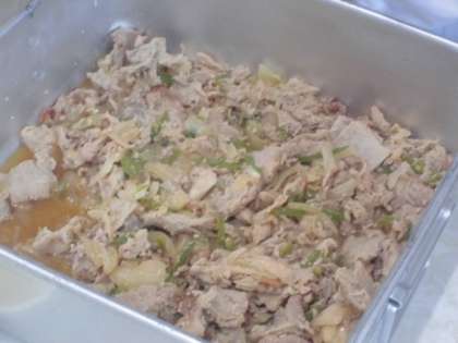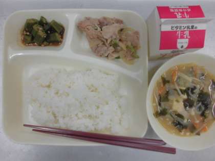 今日の給食のメニューは、豚肉の甘辛焼き、みそ汁、オクラのおかか炒め、牛乳、ごはん、でした。豚肉の甘辛焼きは砂糖、塩、しょうゆでしっかりと下味がつけられているので、ごはんがすすみました。たまねぎやピーマンもたれを吸ってしんなりしていておいしかったです。みそ汁はだしがしっかりととられていて、わかめ、にんじん、キャベツ、もやし、とうふ、えのきだけが入っていて具だくさんでした。オクラのおかか炒めはかつおぶしの風味が効いていました。