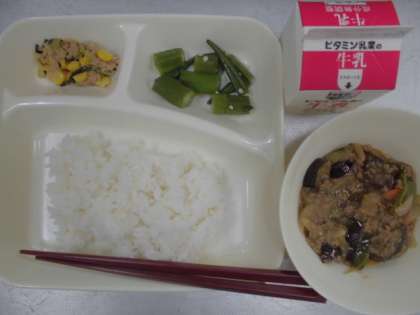 今日の給食のメニューは、麻婆なす、オクラの甘酢和え、ツナとチンゲンサイの炒め物、牛乳、ごはん、でした。麻婆なすは牛豚ひき肉と細かく刻まれたにんじん、たまねぎ、ピーマンが生姜とトウバンジャンで香りよく炒められていて、とろみ具合もばっちりでした。ごはんと一緒に食べるととてもおいしかったです。オクラの甘酢和えは米酢としょうゆをベースにしたドレッシングがかけられていました。ツナとチンゲンサイの炒め物はチンゲンサイの緑が映えて彩りもきれいでした。