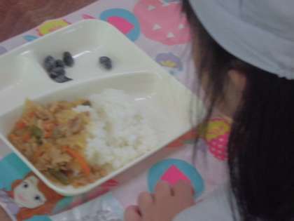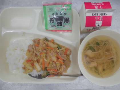 今日の給食のメニューはピリ辛丼、中華スープ、ソフト黒豆、牛乳、でした。ピリ辛丼はとろみがあって中華丼のような感じでしたがトウバンジャンが使われています。生姜やにんにくの香りも効いていて美味でした。具材も豚肉、にんじん、たまねぎ、たけのこ、三度豆とたくさん入っていました。中華スープはコクがあり、鶏肉ともやし、えのきが入っていて、にらの香りが漂っていました。ソフト黒豆は甘納豆のような感じでおやつのようでした。